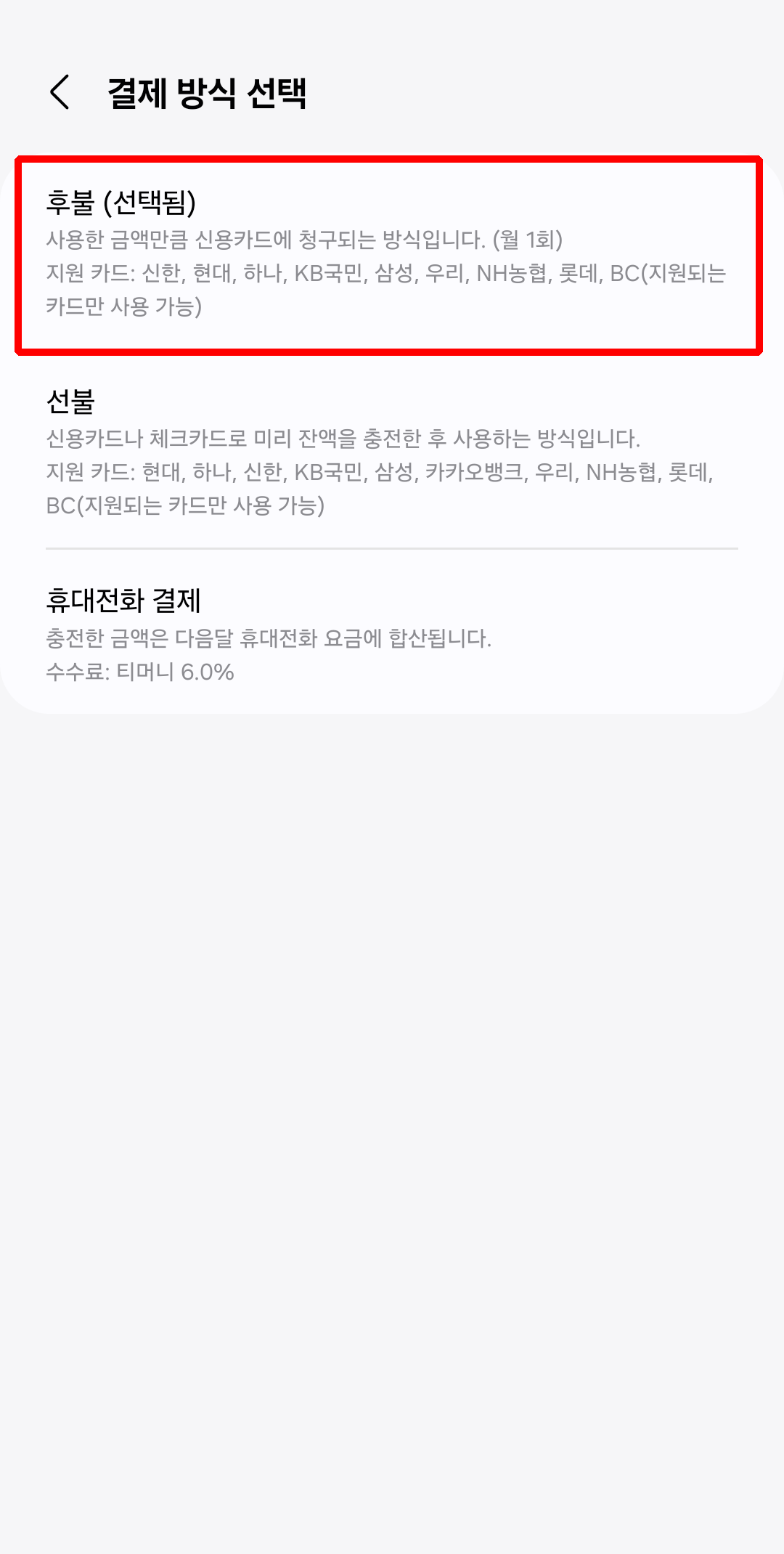 후불, 선불, 휴대전화 결제 중 K패스 체크카드를 이용할 것으로 저희는 후불을 선택해주세요.